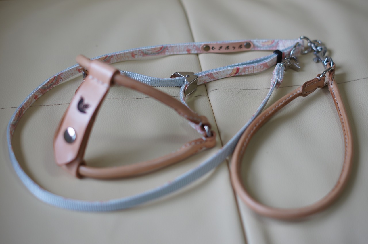 むぎポッポブランドから布と革のハイブリッドハーネスの販売です