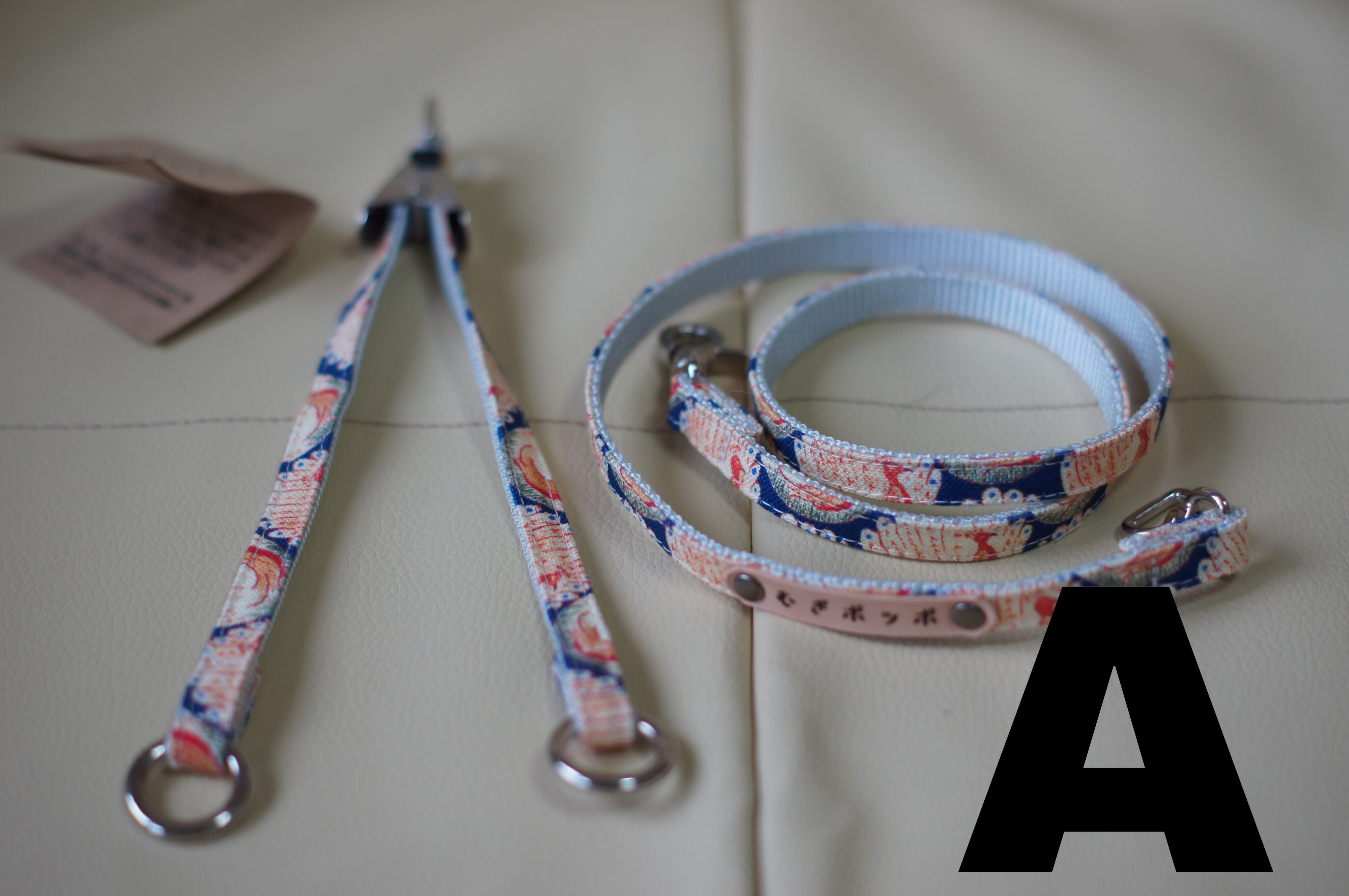 ハーネス部と持ち手のハンドルは麦印犬品オールレザーハーネスの丸革タイプをそのままに、調整部とリードをファブリックとPPテープで仕上げました。