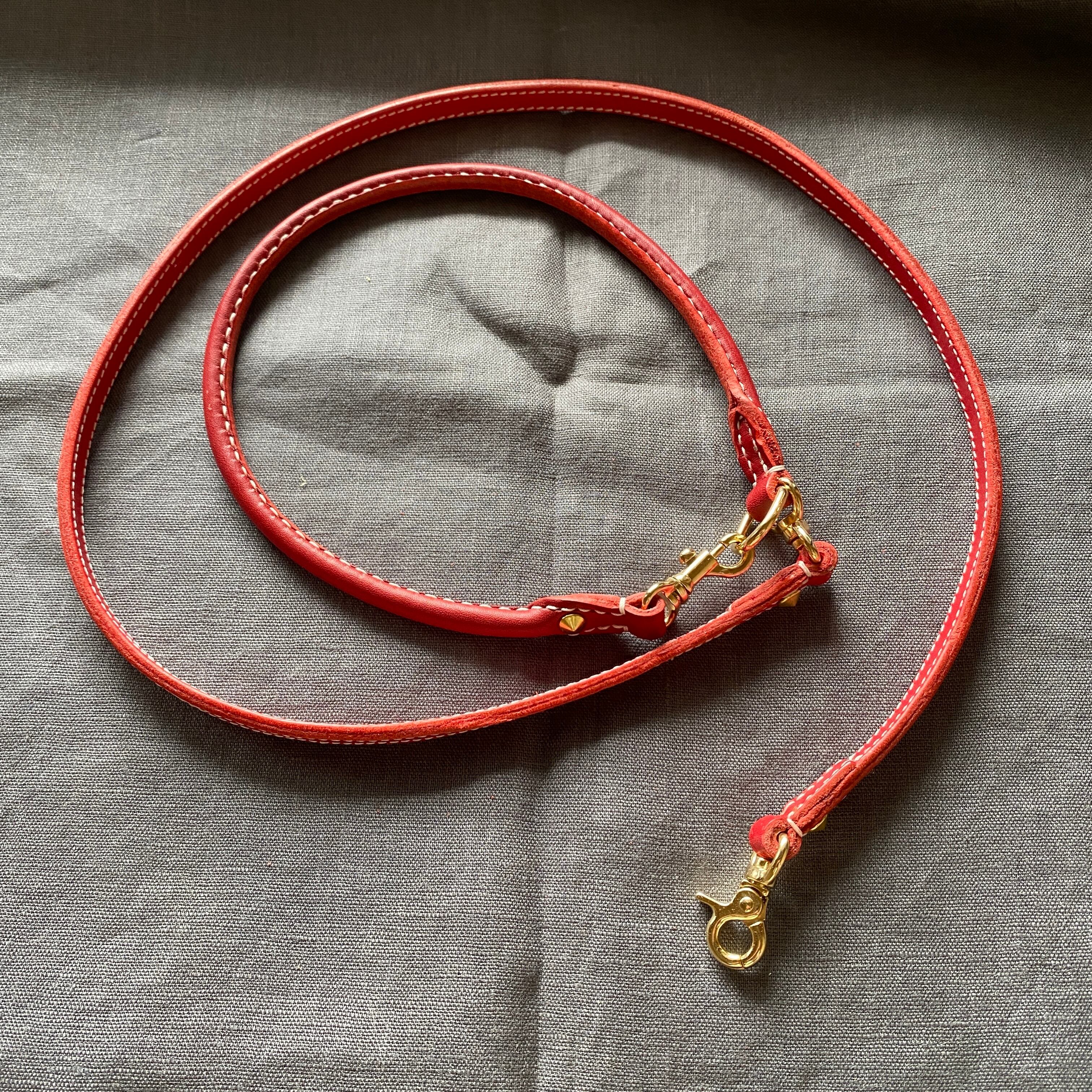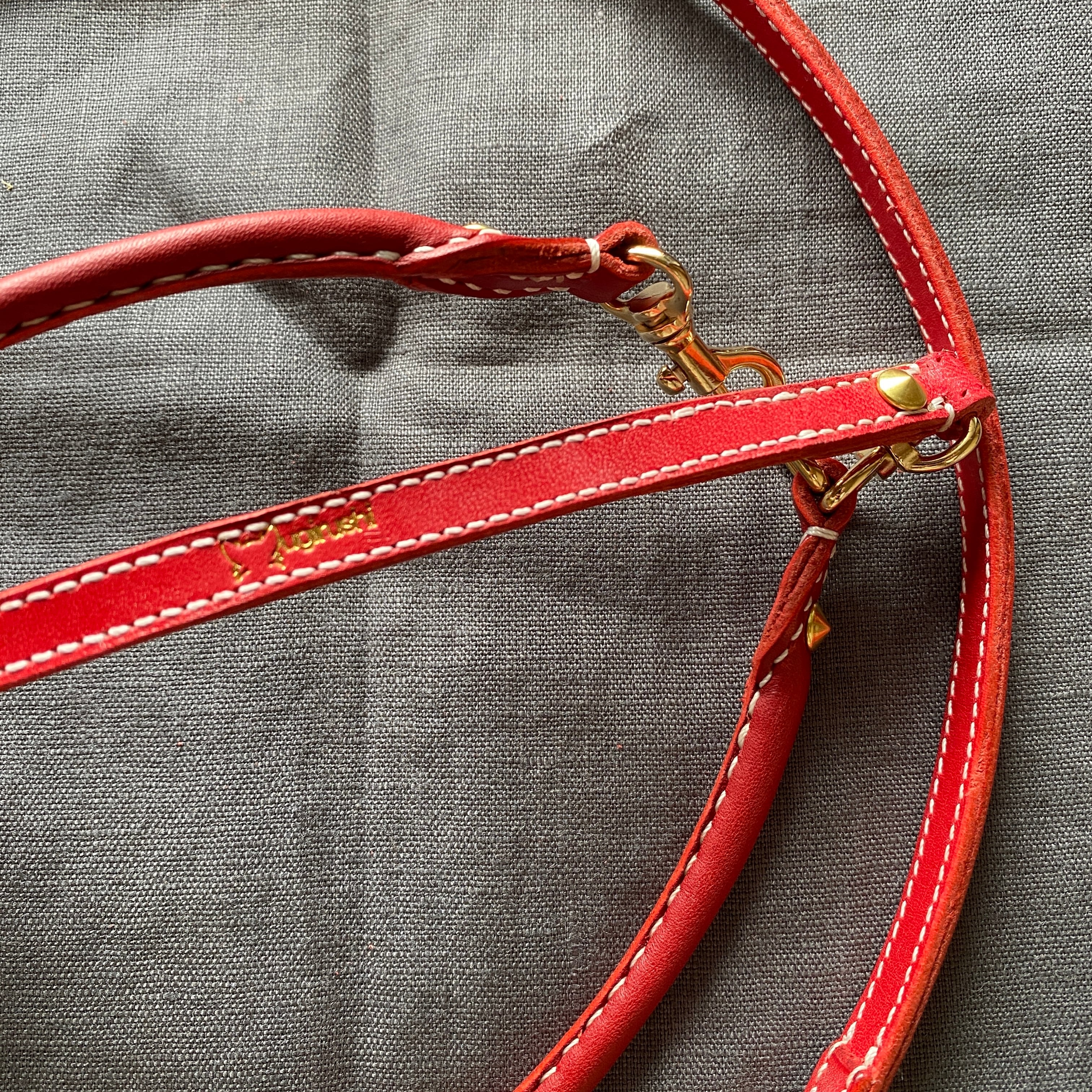 オールレザーリード 本体:赤 ステッチ:白(キナリ) 接続部にピラミッド型カシメ(ゴールド)